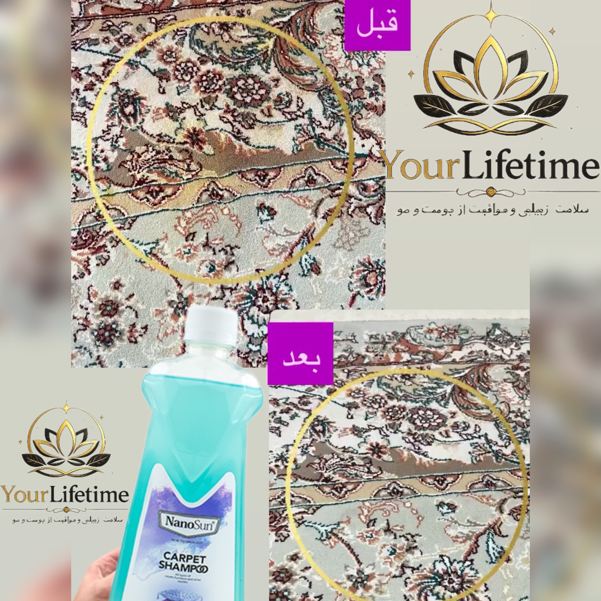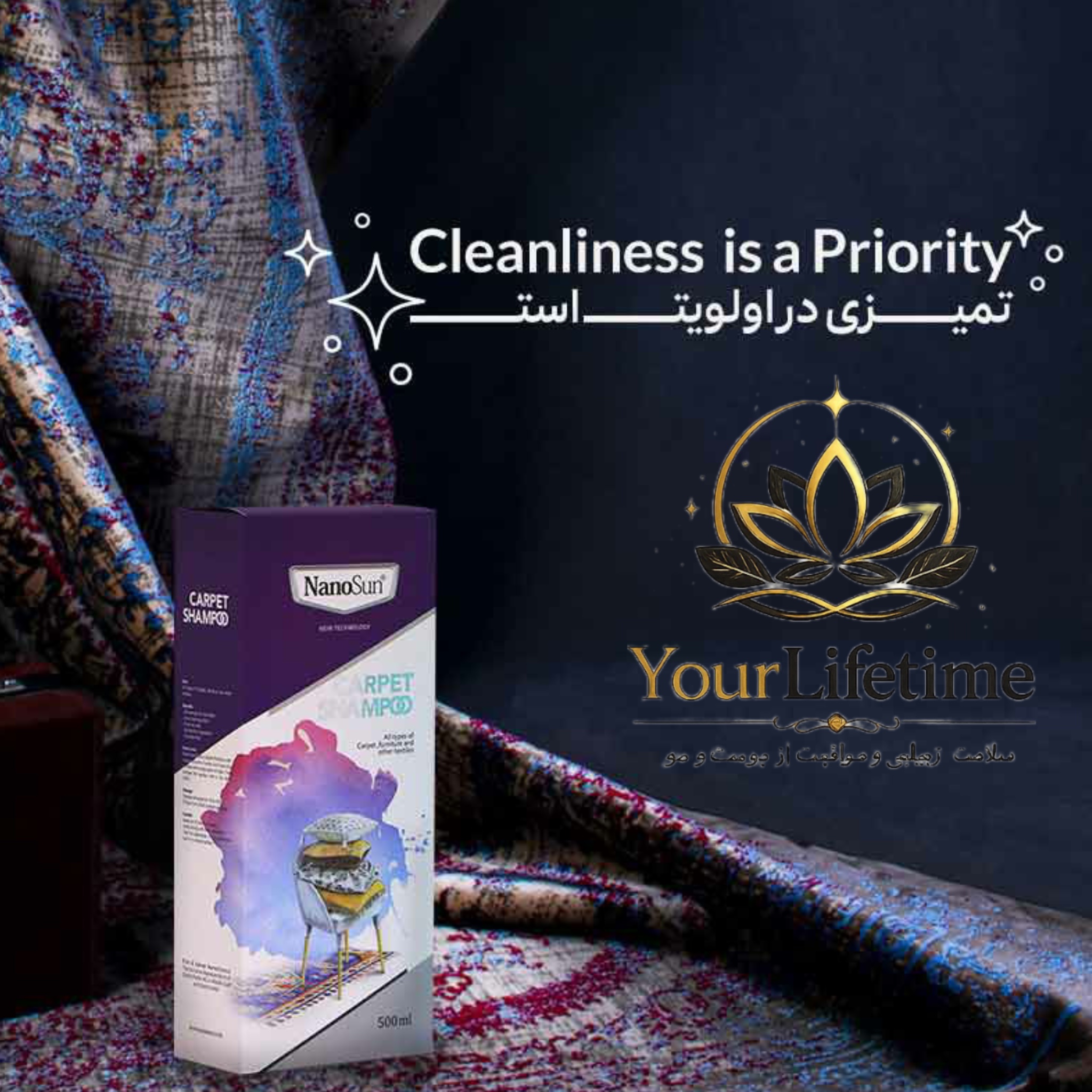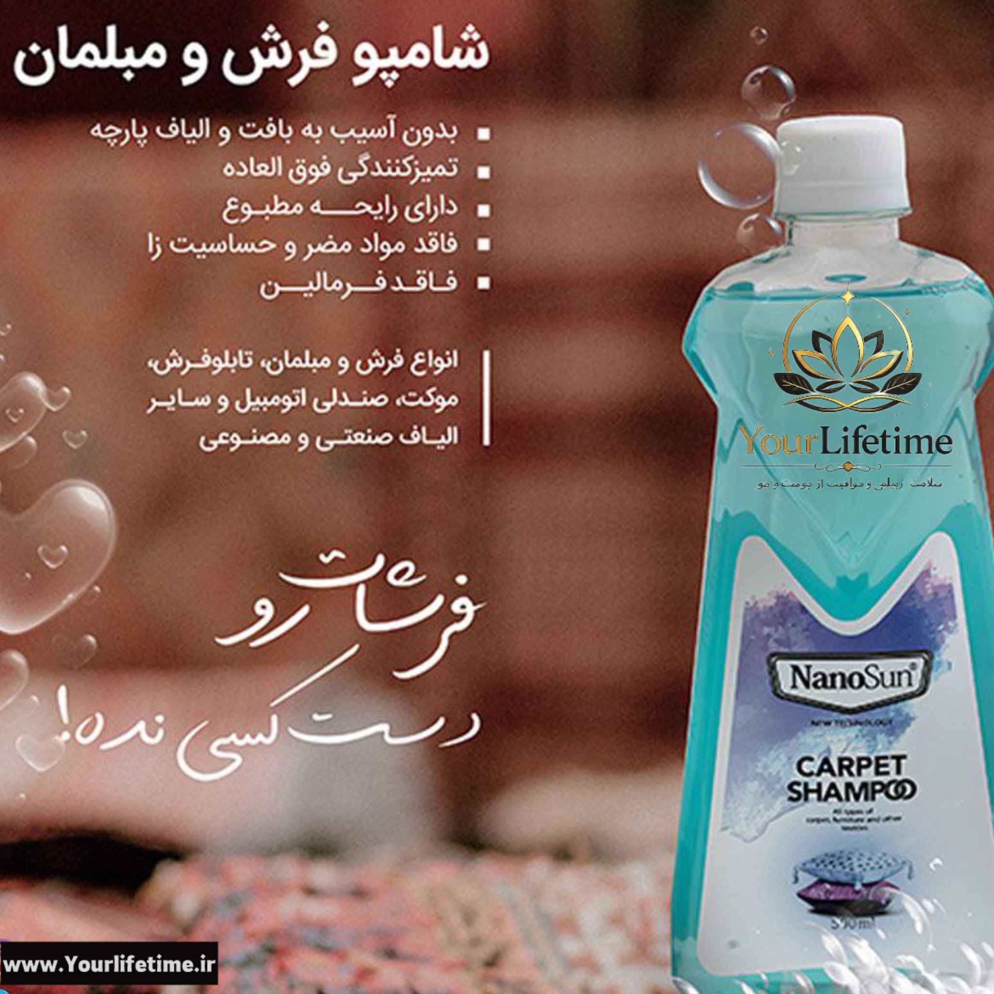 شامپو فرش و مبلمان نانوسان تنها محصول برای تمیز کردن کلی فرش های با الیاف طبیعی و مصنوعی با قدرت پاک کنندگی و جرم بری بالا که هر نوع لکه یا جرم مردگی و کثیفی را به راحتی از بین میبرد و بسیار مقرون به صرف هست و باعث براقی و درخشانی فرش و مبلمان و موکت میگردد.